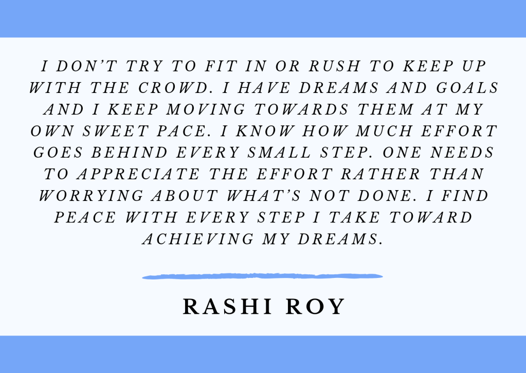 I don’t try to fit in or rush to keep up with the crowd. I have dreams and goals and I keep moving towards them at my own sweet pace. I know how much effort goes behind every small step. One needs to appreciate the effort rather than worrying about what’s not done. I find peace with every step I take toward achieving my dreams.