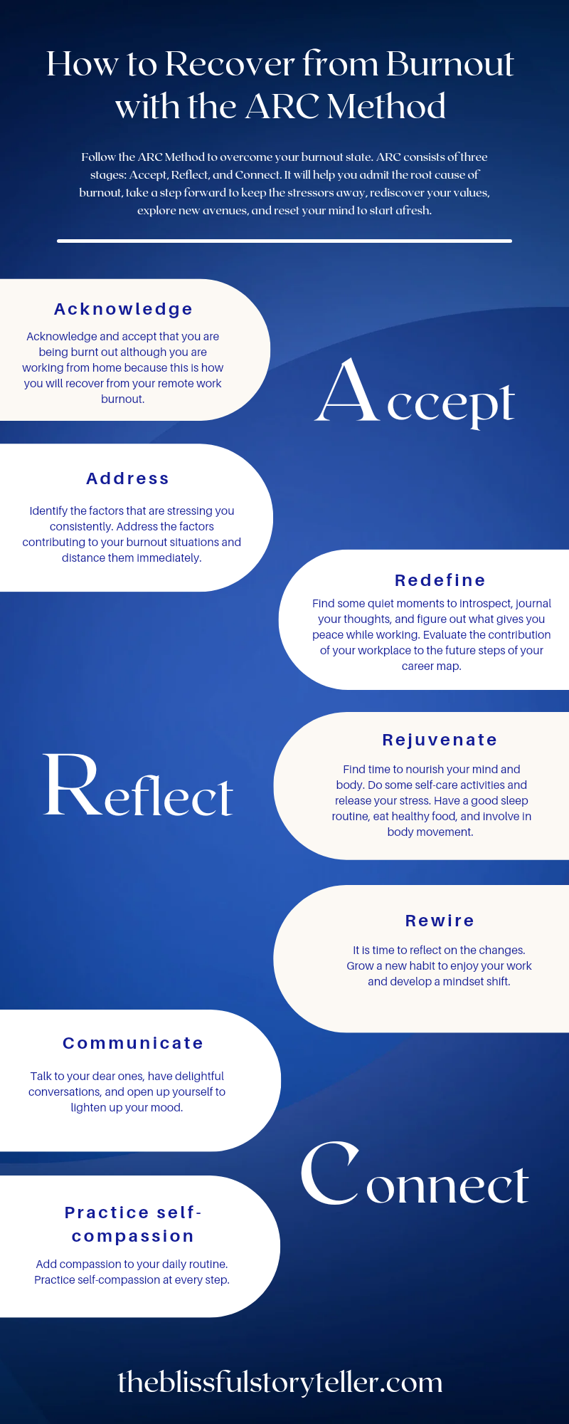 For this purpose, I followed the ARC Method to overcome my burnout state. ARC consists of three stages: Accept, Reflect, and Connect. Each stage had a few steps that helped me admit the root cause of my burnout, take a step forward to keep the stressors away, rediscover my values, explore new avenues, and reset my mind to start afresh.