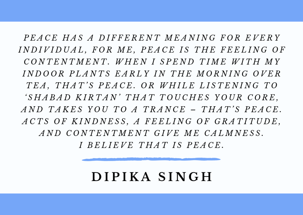 Peace has a different meaning for every individual, for me, peace is the feeling of contentment. When I spend time with my indoor plants early in the morning over tea, that’s Peace. Or while listening to ‘Shabad Kirtan’ that touches your core, and takes you to a trance – that’s Peace. The past year has taught me many life lessons. Nothing in this world could bring back the love and connections that are lost in this pandemic. That dreadful time has also shown its cruel face to me – life is a bubble, and the more space we fill in chances are it will burst abruptly. Acts of kindness, a feeling of gratitude, and contentment give me calmness. I believe that is peace.